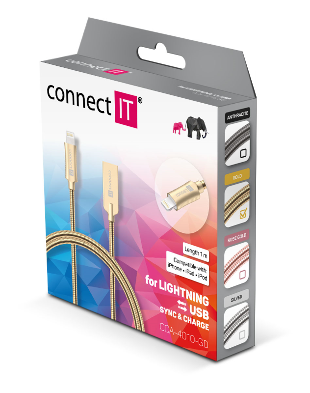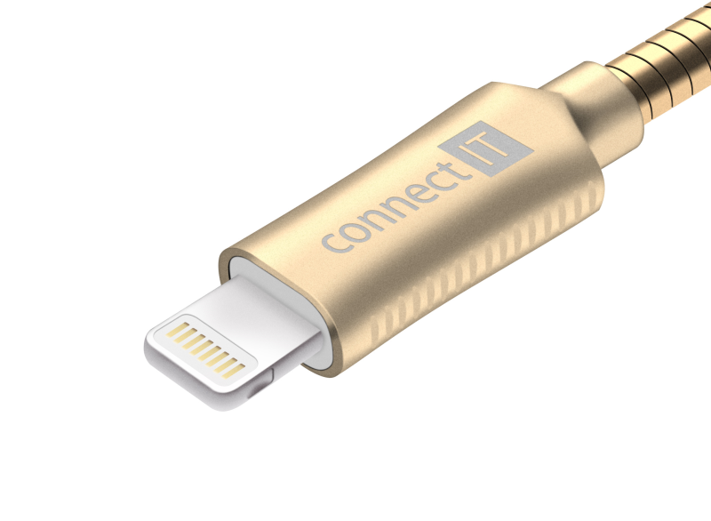 Slouží k nabíjení Apple zařízení s Lightning konektorem a umožňuje současně také přenášet a synchronizovat data, fotografie a hudbu Délka 1 m Speciální prémiový nerezový oplet z vysoce kvalitního nerezového materiálu SAE304 garantuje vysokou odolnost a životnost Pružinová konstrukce opletu zabezpečuje mimořádnou pružnost a ohebnost Oba konektrory uzavřeny v extrémně pevném pouzdře ze speciální slitiny hliníku a zinku Plné využití přenosového protokolu AAP (Apple Accessory Protocol) a funkcionality Apple zařízení Plná kompatibilita s iTunes Kvalitní materiál žil o dostatečném celkovém průřezu umožňuje rychlé nabíjení a plynulý datový přenos Až o 40% rychlejší nabíjení ve srovnání s běžnými kabely Konektory Lightning a USB-A Přenosová rychlost: až 480 Mbps Max. proud: 2,1 A Barva: Metallic Gold (kovová zlatá) Kompatibilita: mobilní telefony Apple iPhone 5/5C/5s mobilní telefon Apple iPhone SE mobilní telefony Apple iPhone 6/6s/7/8 mobilní telefony Apple iPhone 6 Plus/6s Plus/7 Plus/8 Plus mobilní telefon Apple iPhone X tablet iPad 4. generace tablety Apple iPad Mini/iPad Mini with Retina Display tablety Apple iPad Air tablety Apple iPad Pro 9.7"/iPad Pro 10.5"/iPad Pro 12.9" přehrávače Apple iPod Nano 7. generace/iPod Touch 5. generace