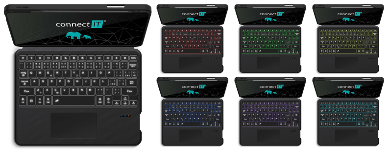 Klávesnice nabízí 13 multimediálních a funkčních kláves, 7 barev LED podsvícení a touchpadem pro snadné a pohodlné ovládání. Pouzdro disponuje stojánkem s nastavitelným náklonem v horizontální i vertikální pozici, a zajistí tak maximální komfort při práci. Nechybí ani přihrádka na dotykové pero.