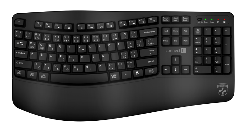Klávesnice kromě klasických funkcí disponuje 12 multimediálními a funkčními klávesami, které se obzvláště hodí do kancelářského prostředí. Příjemný ergonomický náklon klávesnice pomáhá proti únavě zápěstí během dlouhých pracovních relacích. Samozřejmostí je jeden nano přijímač, který má dosah až 10 metrů. V balení je dodáváná originál CONNECT IT alkalická baterie (1x AA).