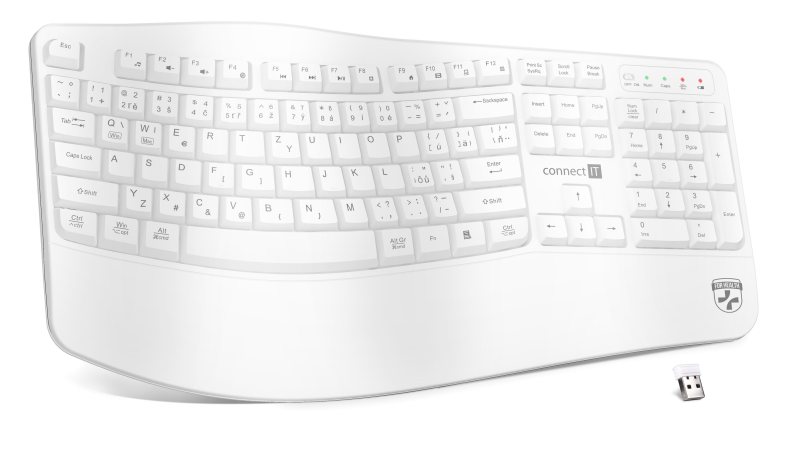 Klávesnice kromě klasických funkcí disponuje 12 multimediálními a funkčními klávesami, které se obzvláště hodí do kancelářského prostředí. Příjemný ergonomický náklon klávesnice pomáhá proti únavě zápěstí během dlouhých pracovních relacích. Samozřejmostí je jeden nano přijímač, který má dosah až 10 metrů. V balení je dodáváná originál CONNECT IT alkalická baterie (1x AA).