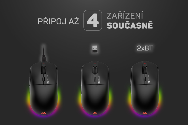 Díky 4Mode připojní lze myš připojit až ke 4 různým zařízení. Precizní optický senzor má nastavitelnou citlivost až na 8000 DPI. Samozřejmostí je pozlacený USB Nano přijímač a dodávaný nabíjecí a přívodní kabel s prémiovým opletem.