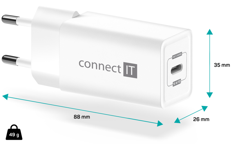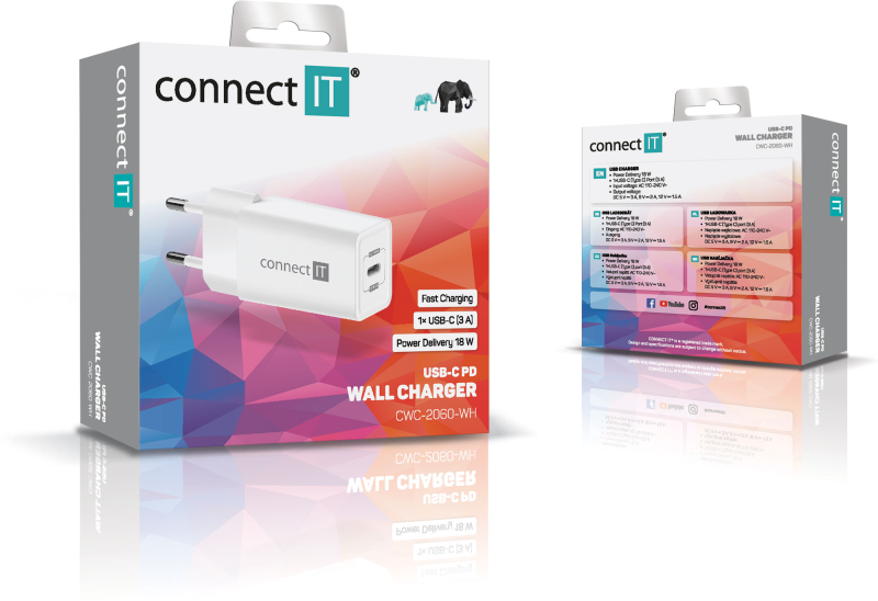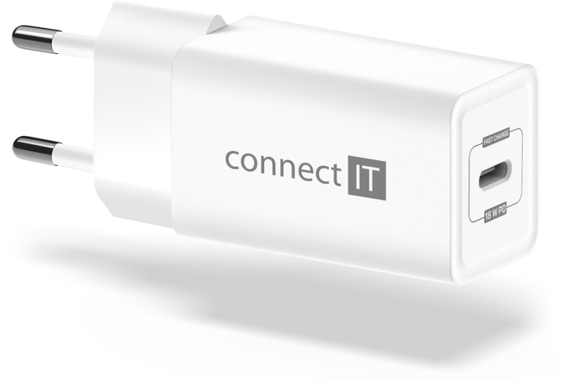 Cestovní USB nabíječka CONNECT IT "Fast PD Charge" určená pro napájení i nabíjení mobilních telefonů, tabletů, power bank, akčních kamer, elektronických čteček knih, MP3 a MP4 přehrávačů, herních konzolí a mnoha dalších přenosných zařízení doma, v kanceláři i na cestách. Technologie Power Delivery (PD) umožňuje rychlonabíjení o výkonu 18 W.